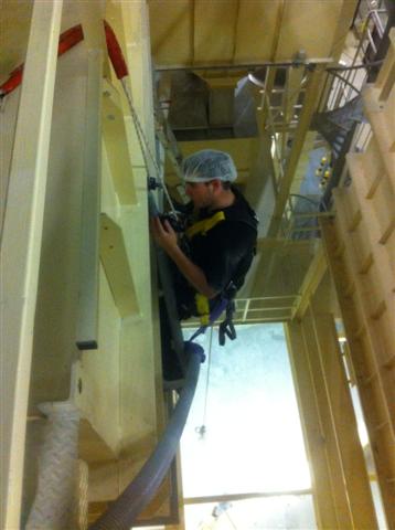 In a hygienic environment such as the food industry, high demands are placed on all necessary resources for maintenance work. One of the many advantages of industrial abseiling techniques is that one needs very few (labour) resources to carry out work at height. So there is no need to drag scaffolding parts or drive in aerial platforms which often create unhygienic situations. Apart from the necessary tools for maintenance work, ropes and abseiling materials, our rope access technicians do not need much else to carry out the work. Furthermore, they always adapt their work clothes and PPE to the working environment in order to work as hygienically and safely as possible.