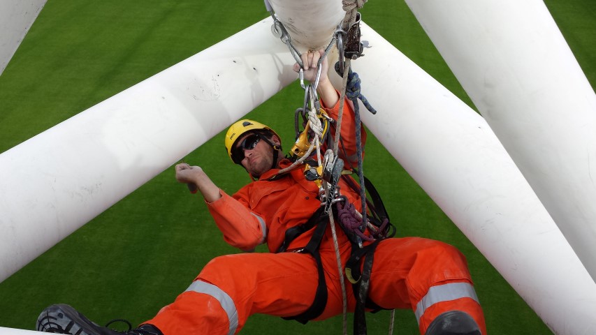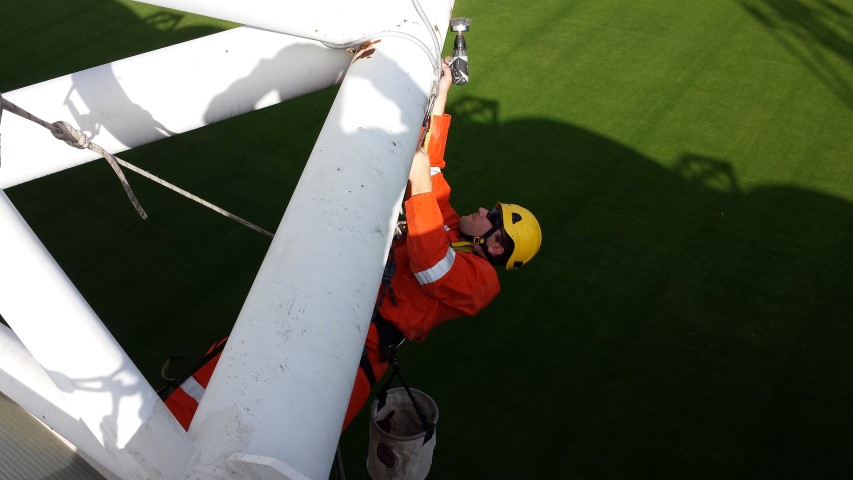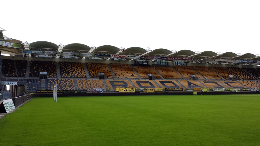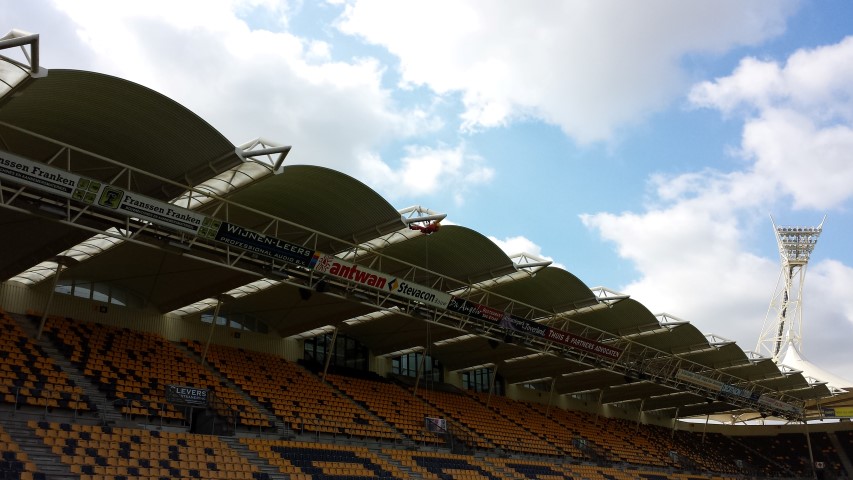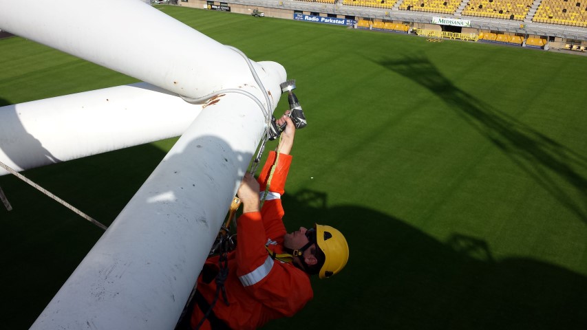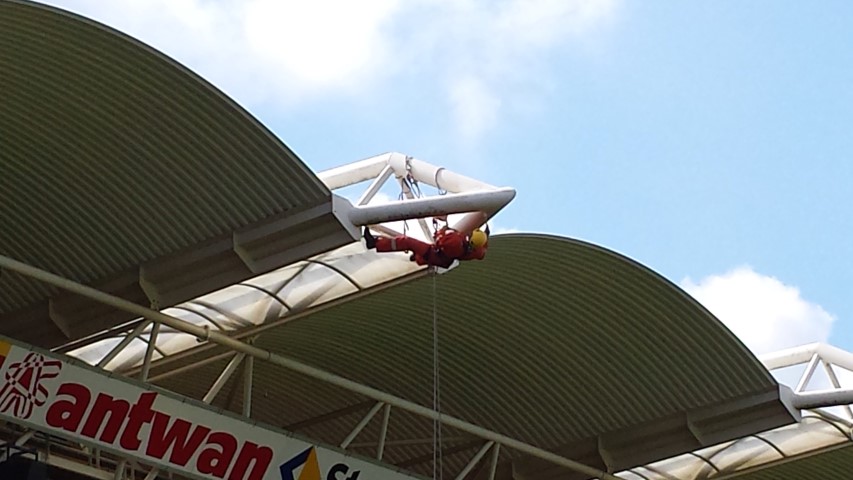 In collaboration with Wessels, A.T.I. Abseiltechnieken carried out maintenance work at the Parkstad Limburg stadium of football club Roda JC in Kerkrade. Some places in the stadium were very difficult to reach for maintenance work. Where a large crane or aerial platform could not reach, A.T.I. Abseiltechnieken could easily get to the location to complete maintenance work.