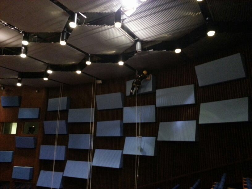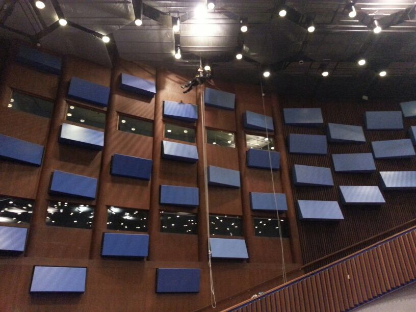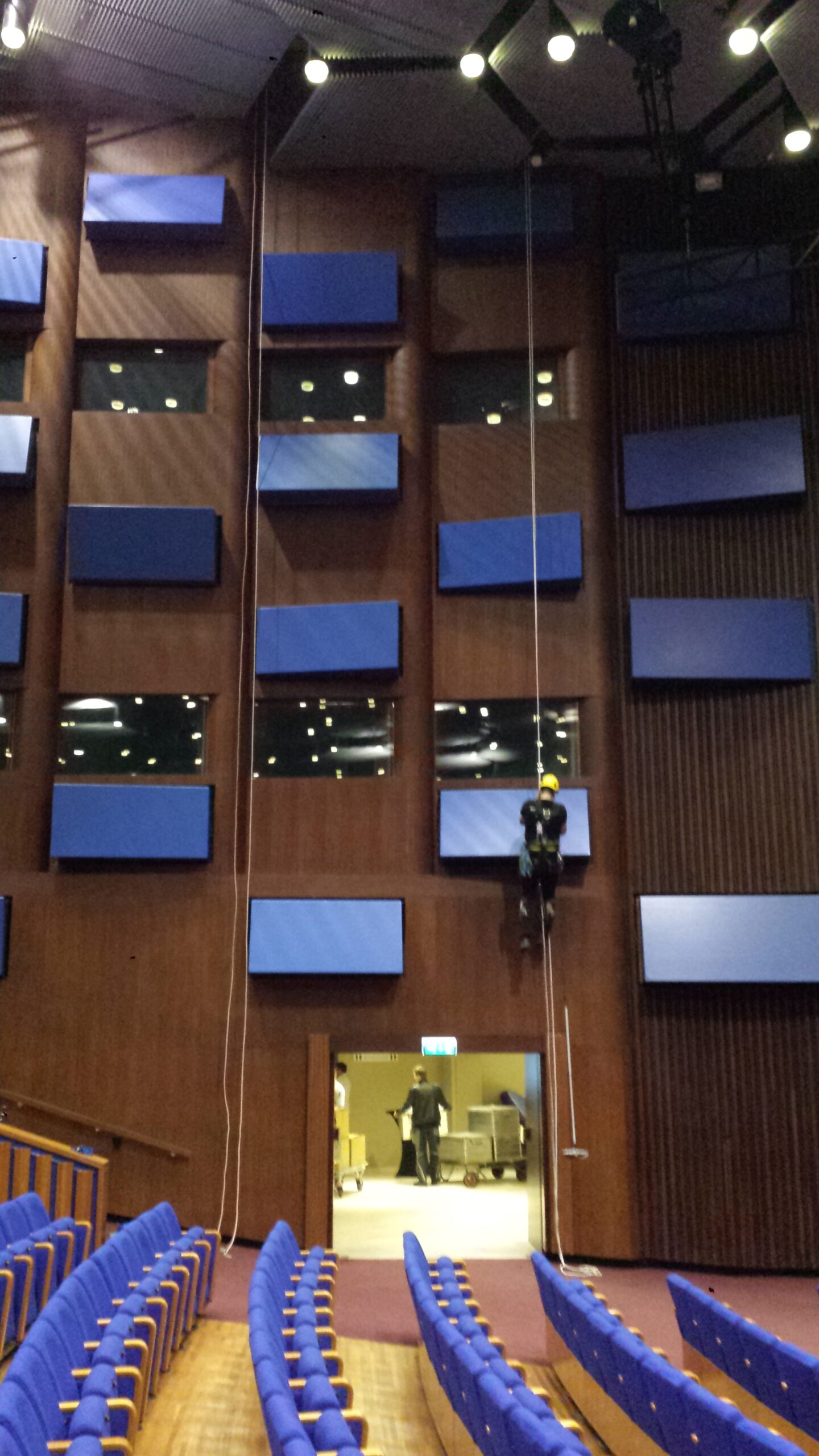 A.T.I. Abseiltechnieken performed cleaning work at the World Forum in The Hague. The slats and lights in the ceiling are in locations that are difficult to reach. Our rope access techniques allowed us to easily position ourselves at height and carry out the work safely and efficiently.