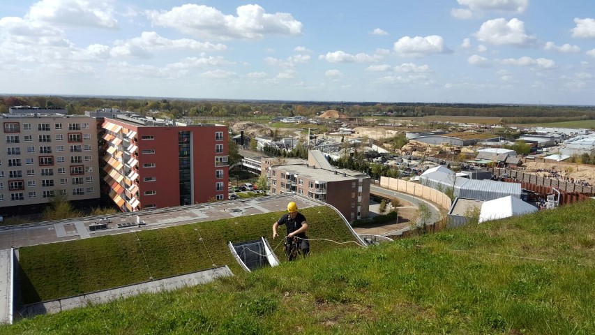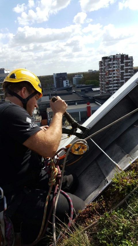 122 Views 0 Likes Alpinists assemble lightning rod Atlas Theatre Emmen Commissioned by Jules Goossens Bliksembeveiliging BV, A.T.I. Abseiltechnieken mounted lightning rods on top of the roof of the Atlas Theatre, the new entrance to the zoo, Wildlands Emmen.