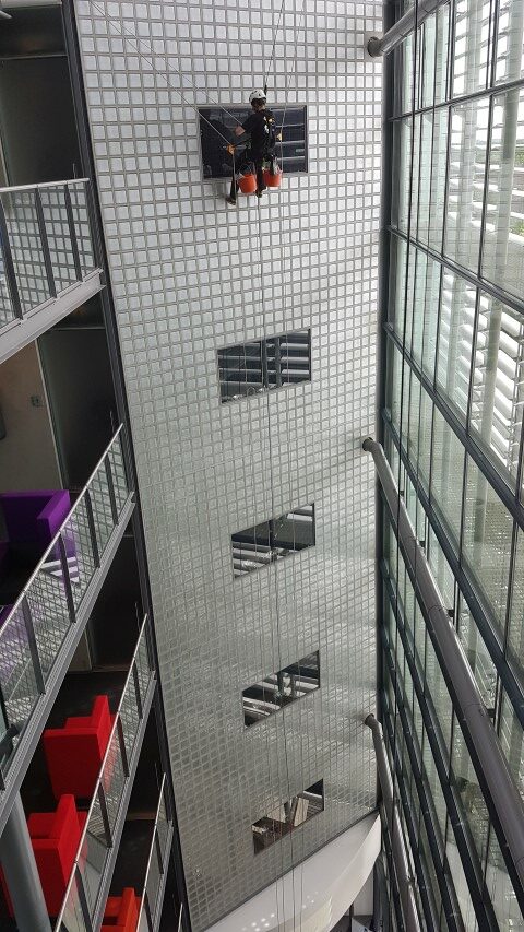 On behalf of Dolmans Calamities, ATI Abseiltechnieken carried out cleaning work of two atriums in an office building. Some locations in an atrium were very difficult to reach, making the application of our rope techniques a good solution. Using our rope access techniques, we were able to easily position ourselves at the location and thus carry out the requested work for the client.