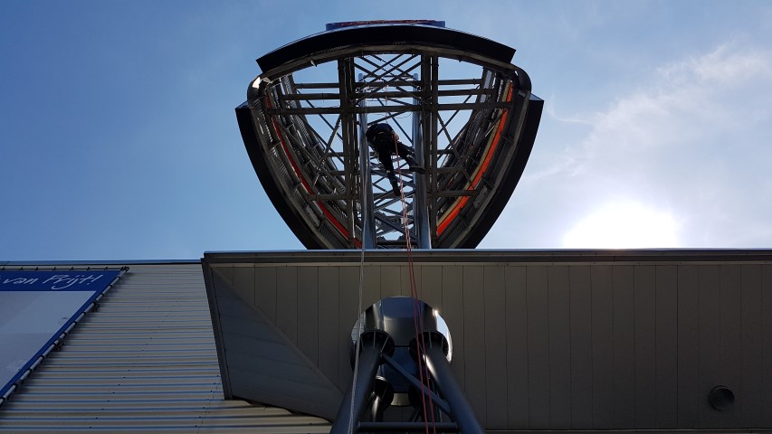 On behalf of Wits Zuid, A.T.I. Abseiltechnieken painted part of an advertising mast. Part of the mast was difficult to reach for conventional high-lift methods, so applying our rope access techniques was a good solution. Our rope access specialists could easily position themselves in the mast and thus carry out the painting work for the client.