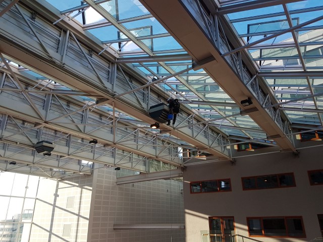 In collaboration with Roodenburg, A.T.I. Abseiltechnieken replaced fans in an atrium. The fans were at such a height that they were difficult to reach for conventional aerial work methods. For this, our rope access techniques were a good solution for carrying out the maintenance work at height. We can position ourselves safely and efficiently at heights and then carry out the required maintenance work.