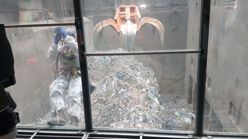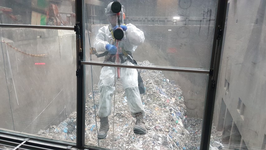 On behalf of EEW Energy From Waste in Delfzijl, A.T.I. Abseiltechnieken assisted in the replacement of crane cabin windows. Maintenance work inside the waste bunker is usually very difficult to access. We could easily position ourselves on the outside of the cabin and thus perform the assistance work. Our rope access abseiling techniques make working with conventional aerial work methods unnecessary. In virtually any industrial situation, we can position ourselves at any location. Our abseiling techniques ensure minimum disruption to ongoing processes and all work is carried out safely and efficiently.
