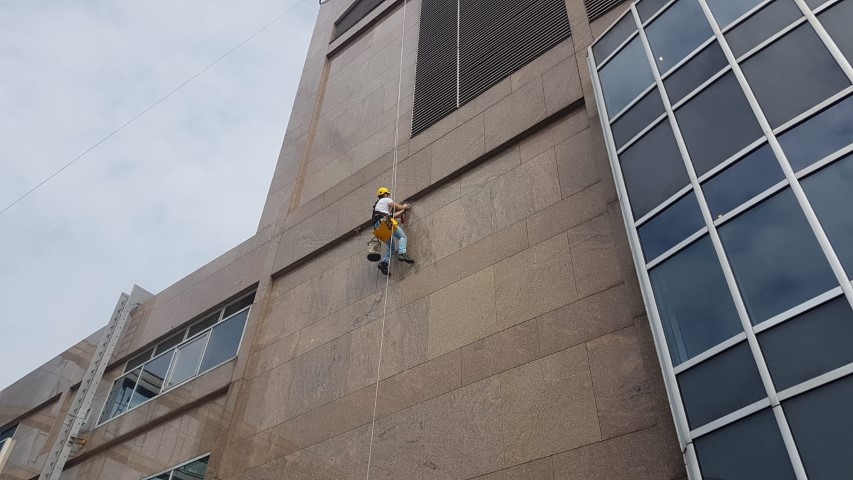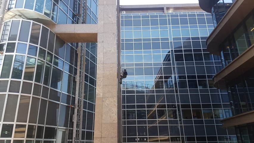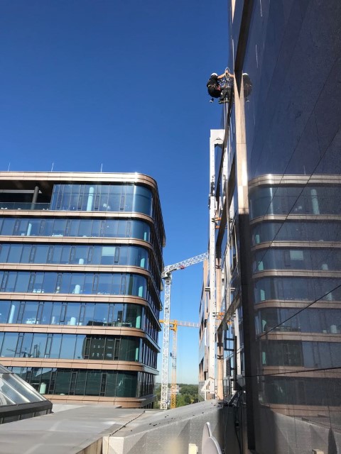 On behalf of Mutsaerts, A.T.I. Abseiltechnieken carried out inspection and maintenance work on an office building in Amsterdam. Some parts of the facades were very difficult to reach for conventional high-lift methods. This made using our abseil techniques also known as rope access a good solution. We were able to position ourselves safely and efficiently at the difficult-to-reach locations and then perform inspection and any maintenance work at height for the client.