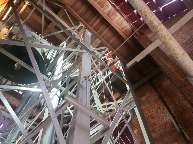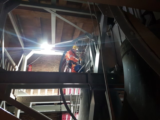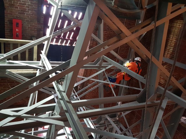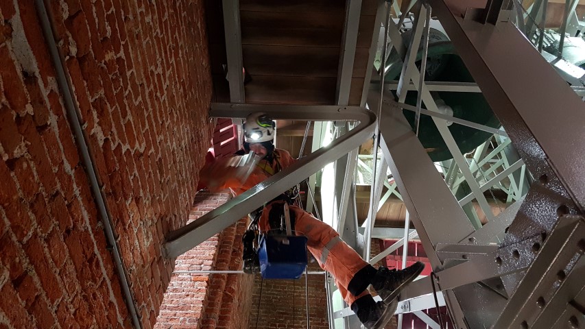 On behalf of Van der Geest Schildersspecialisten, A.T.I. Abseiltechnieken carried out maintenance work on the inside of the Oldehove in Leeuwarden last year. Inside the monumental tower is a large steel structure that required periodic maintenance. Due to the limited space between the walls and steel construction, erecting scaffolding is very laborious. Our abseiling techniques also known as rope access was an excellent solution for this. Our technicians could easily position themselves on the sites to perform maintenance work in locations that were difficult to reach. Among other things, we reinforced the steel structure and carried out painting work.