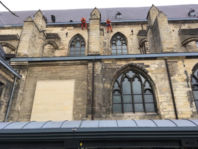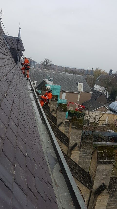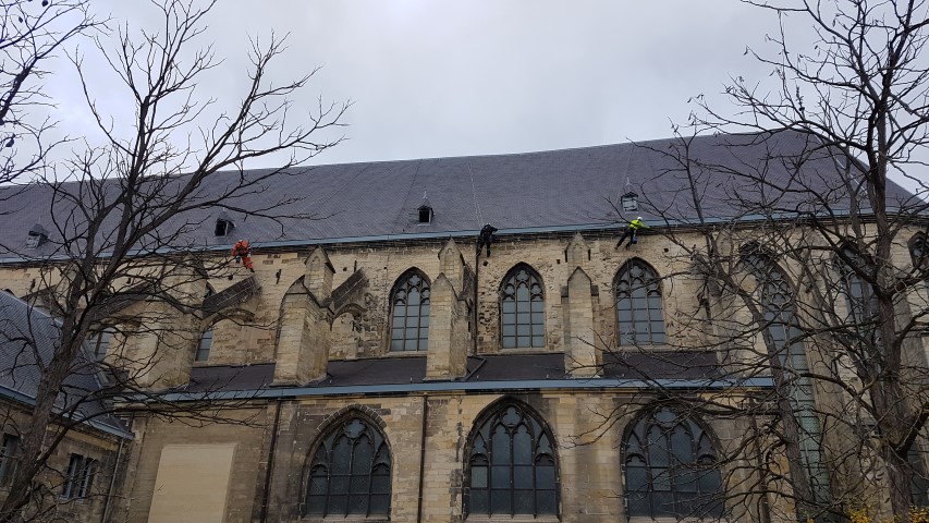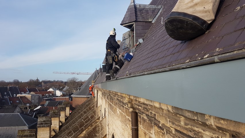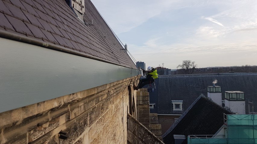 Commissioned by Schildersbedrijf Heythuysen, A.T.I. Abseiltechnieken carried out painting work on the Minderbroederskerk in Maastricht. The church is located in the Regional Historic Centre Limburg, and placing cranes or scaffolding creates a major obstruction for traffic and the public. Applying our abseiling techniques, also known as rope access, was therefore an excellent solution. We could easily position ourselves on location and thus carry out all the painting work on the hard-to-reach areas. Among other things, we painted all fascias and window frames. A great job as an example of all the advantages of our rope access techniques. We can position ourselves safely and efficiently at hard-to-reach locations without causing any nuisance to the surroundings.