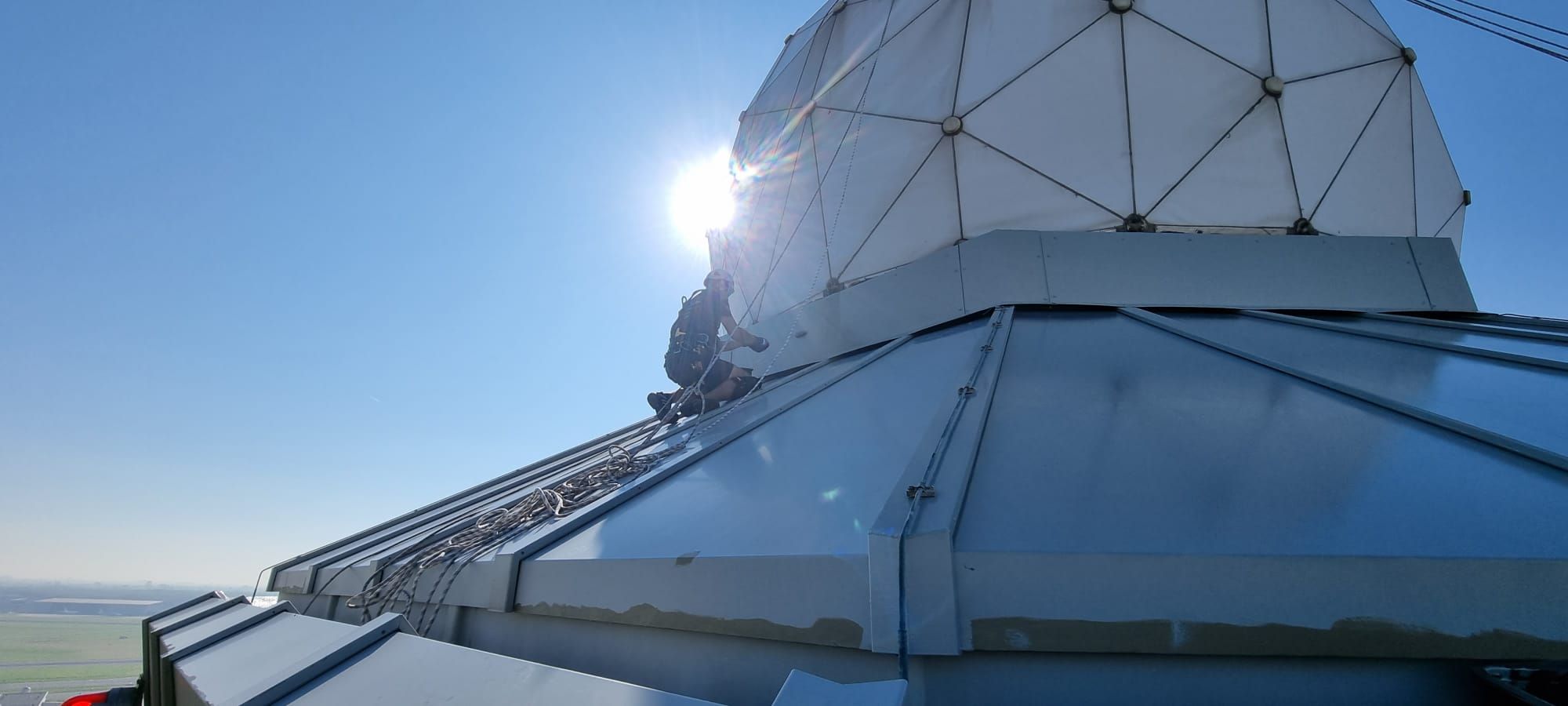On behalf of Luchtverkeersleiding Nederland, A.T.I. Abseiltechnieken carried out maintenance work on the radome of the tower of Luchtverkeerleiding Nederland. Our rope access techniques allowed us to position ourselves on the outside of the radome and thus perform the requested work in a safe and efficient manner.