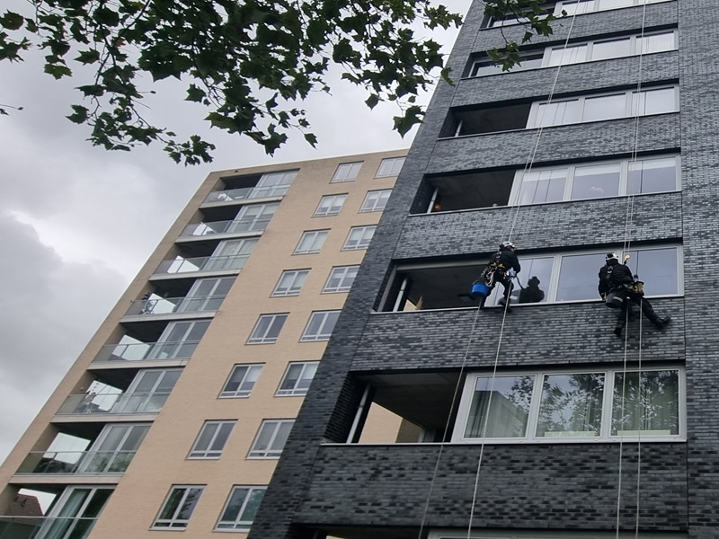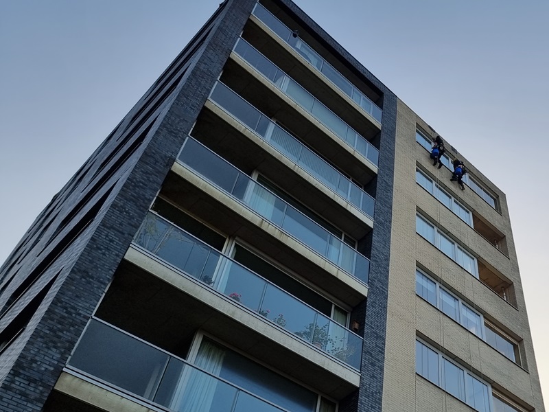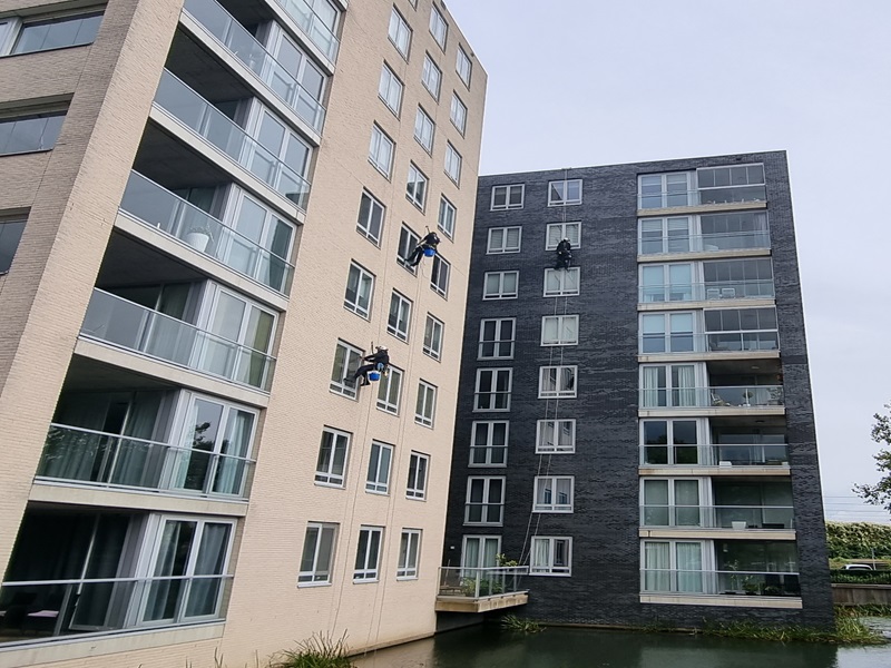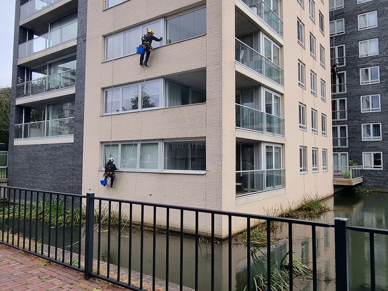 Commissioned by De Kroon Schoonmaak, ATI Abseiltechnieken washed the windows of an apartment complex in Maarssen.Due to the building’s location by the water and its height, it was difficult to reach all around it for traditional aerial work methods. By deploying our abseil techniques, however, the windows could be washed safely and efficiently. Our rope access technicians could quickly position themselves along the facades and wash all the windows.