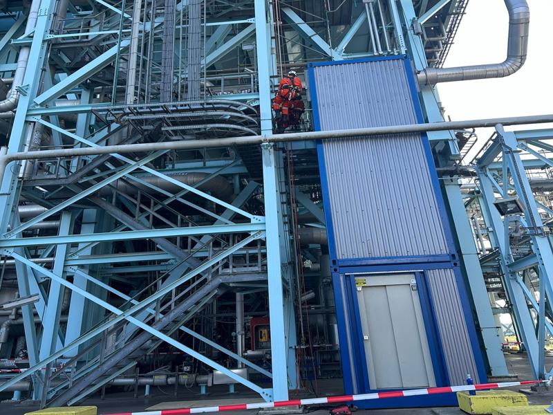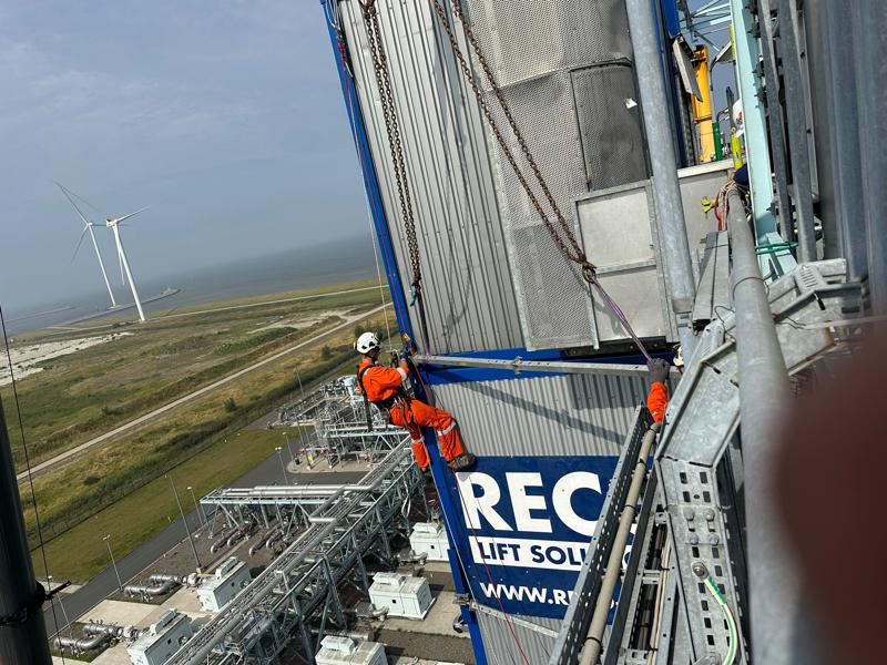 Abseiltechnieken provided assistance for the (dis)assembly of a lift at the RWE Magnum power plant at Eemshaven. In collaboration with crane company Mammoet, we first dismantled the old lift in parts. The new lift was then assembled on behalf of Reco Lift Solutions. The total shaft height of the lift is 53 metres. Our industrial rope access techniques were an excellent solution to assemble the lift at height. A large aerial work platform was initially reserved but in practice, our rope access technicians proved much easier to position in the hard-to-reach locations, as well as performing the work safely and more efficiently.