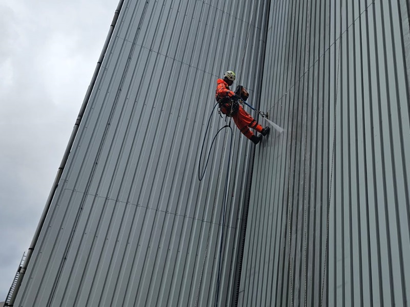On behalf of IJB Group in Lemmer, ATI Abseiltechnieken carried out cleaning work at height on the facades and some silos. The whole was thoroughly cleaned with our high-pressure cleaner by our rope access technicians.