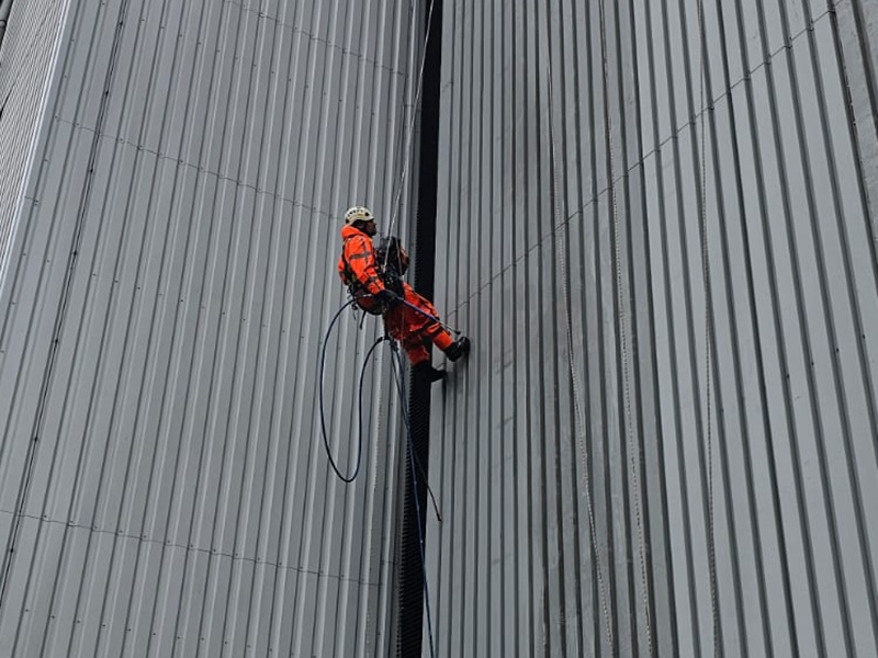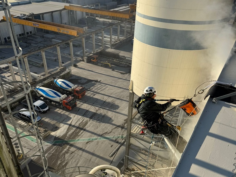 Our industrial abseiling techniques offer an excellent alternative for reaching hard-to-reach locations. After carefully recording the anchor points present on top of the silos, our rope access specialists were able to position themselves efficiently along the silos and carry out the cleaning work.