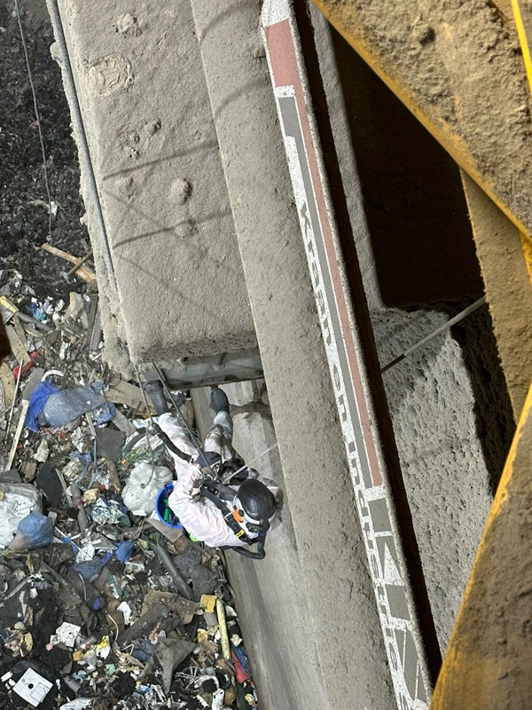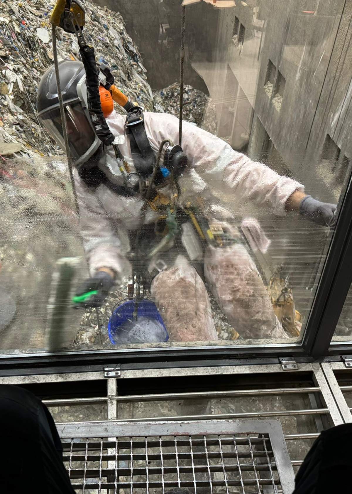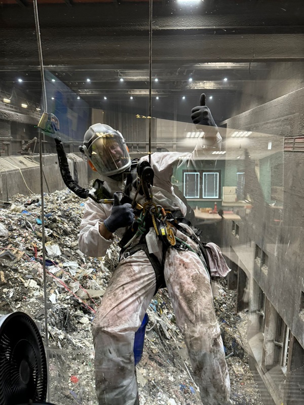 For our client EEW Energy From Waste Delfzijl, we wash the windows of the crane cabin several times a year. The EEW plant in Delfzijl is a large waste processing company that processes several hundred thousand tonnes of waste annually. The crane cabin windows are located in the waste bunker, which cannot be reached by standard aerial work methods. Through our industrial abseiling techniques, the windows can be reached. Our rope access specialists can position themselves in the waste bunker in front of the crane cabin and thus perform window cleaning at height. Periodic performance keeps the windows clean and the operator’s view of his work.