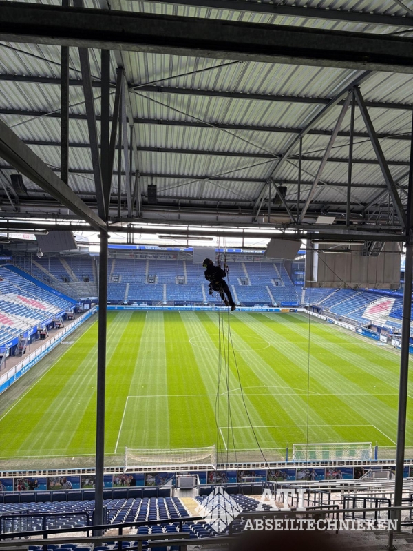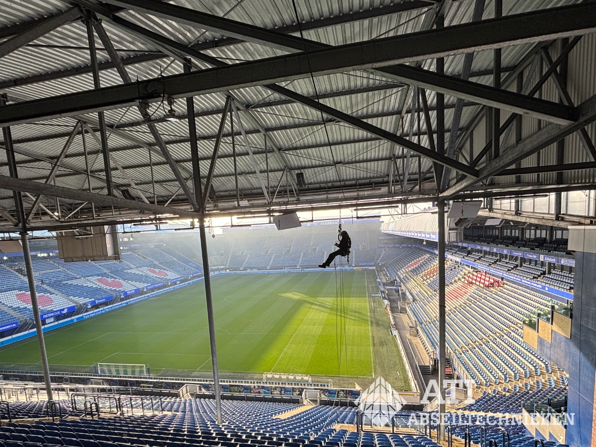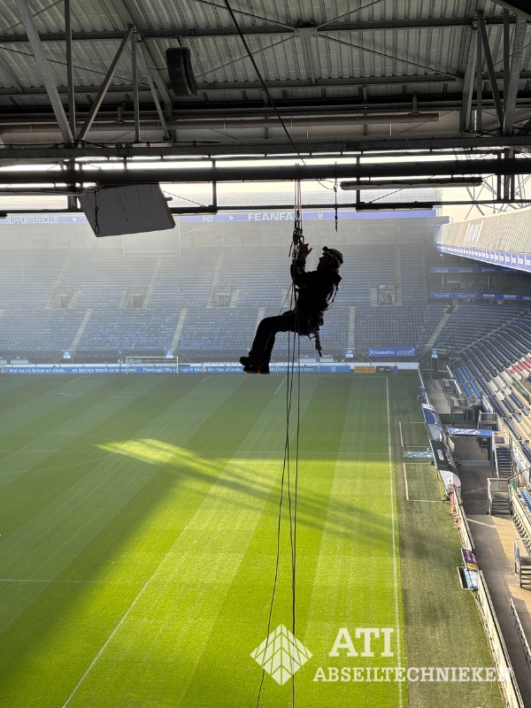 Last week, we replaced the hoisting system in the Abe Lenstra Stadium for our client SC Heerenveen. We regularly carry out work in various football stadiums. Maintenance work, such as in the roof and above the stands, is difficult or impossible to reach using traditional aerial work methods. We offer a safe alternative with our rope access techniques. The steel structure of the football stadium is excellent for our anchor points so that our rope access specialists can climb to the right location and perform maintenance work at height.